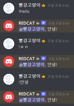 인사를 하면 인사를 받아주는 간단한 명령어를 만들어 보았다. 다음에는 봇이 내가 한 말을 그대로 따라 하는 명령어를 만들어 볼 것이다.
