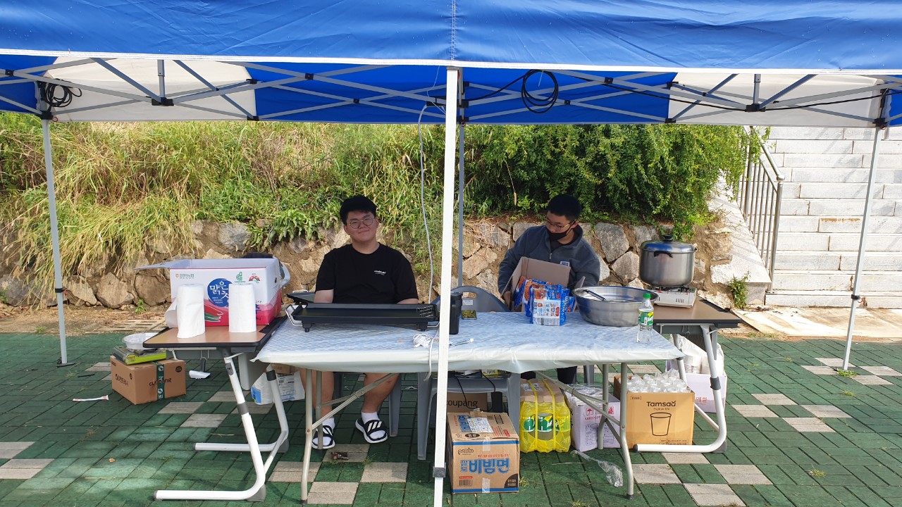 전날 저녁에 친구들과 저기서 노래를 들으면서 재미있게 놀았다. 그러고 다음날 아침에 내려와서 부스 주변 정리를 하고 고기를 굽고 하기 편하게 준비를 했다.
