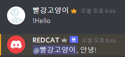기존의 명령어인 !Hello와 새로 추가한 !ㅎㅇ, !안녕 이라는 명령어도 잘 작동하는 모습을 볼 수 있다.