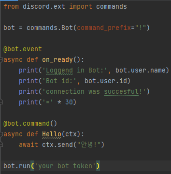 위 Hello라는 함수는 디스코드에서 !Hello를 했을 경우 봇이 안녕!이라고 답해주는 간단한 명령어이다.